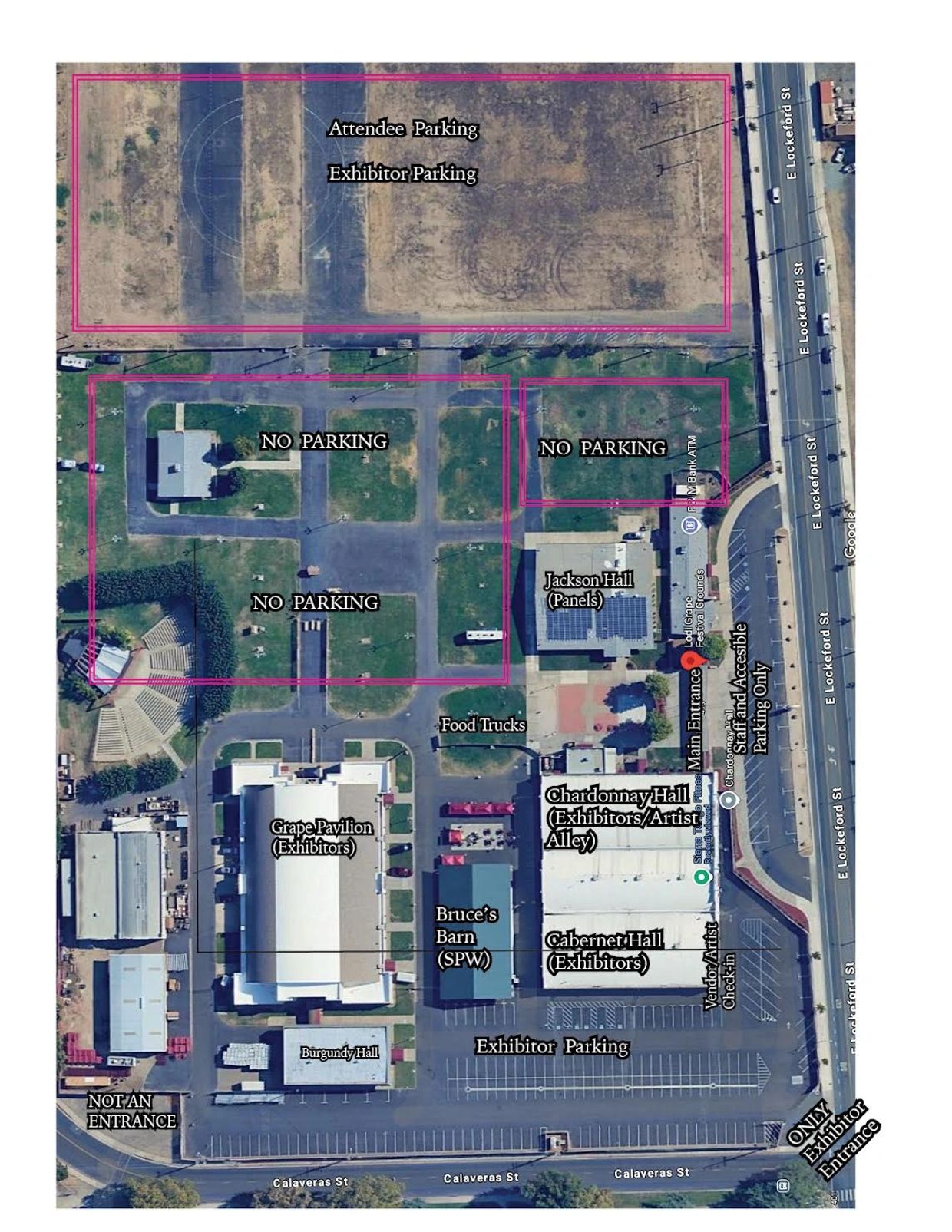 There are three Festival sponsored parking lots: on Cherokee Lane and Lockeford Street next to the fairgrounds, on Lockeford Street directly across from the fairgrounds and behind the Grape Bowl with access on Calaveras Street and Stockton Street.